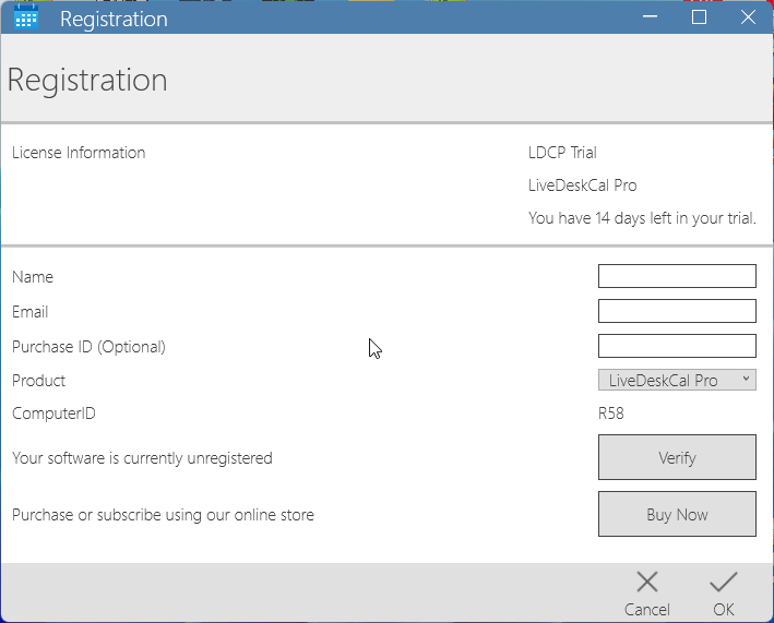 If you purchase the Lite or Pro version of LiveDeskCal, your Name and Email are all you need to Register.